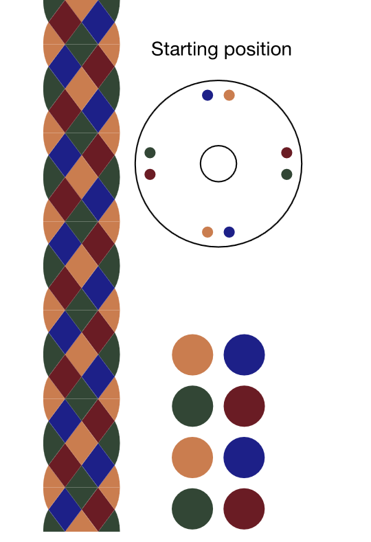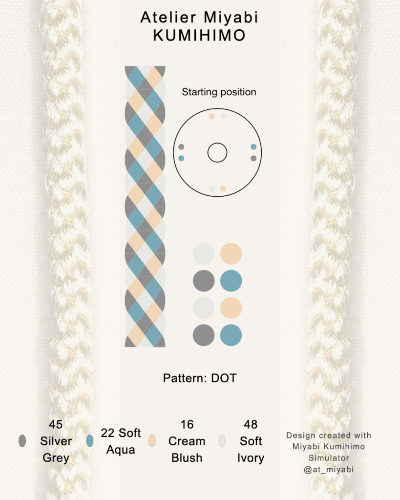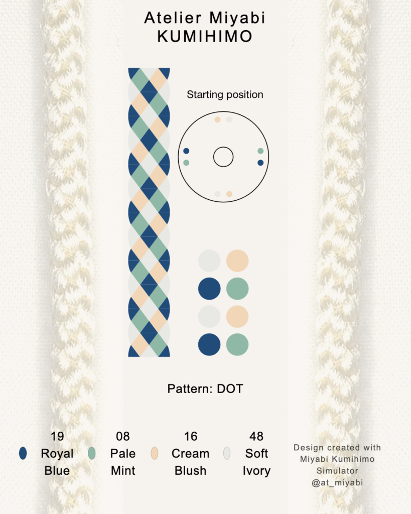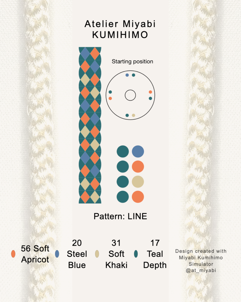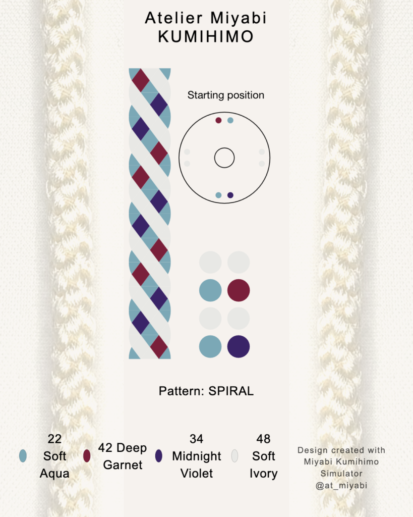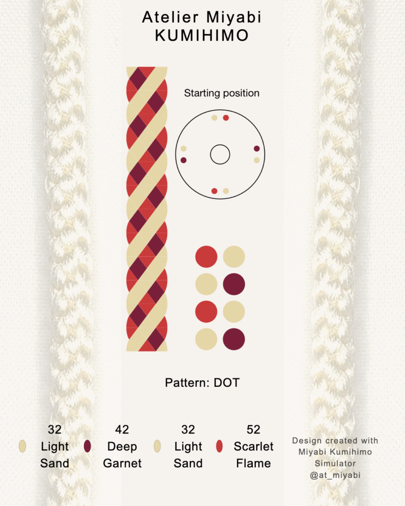 📖 For hand-braiding reference, a simplified marudai starting position based on the selected four-color combination is also shown above. For educational purposes, this layout may be referenced in kumihimo classes or instructional materials.