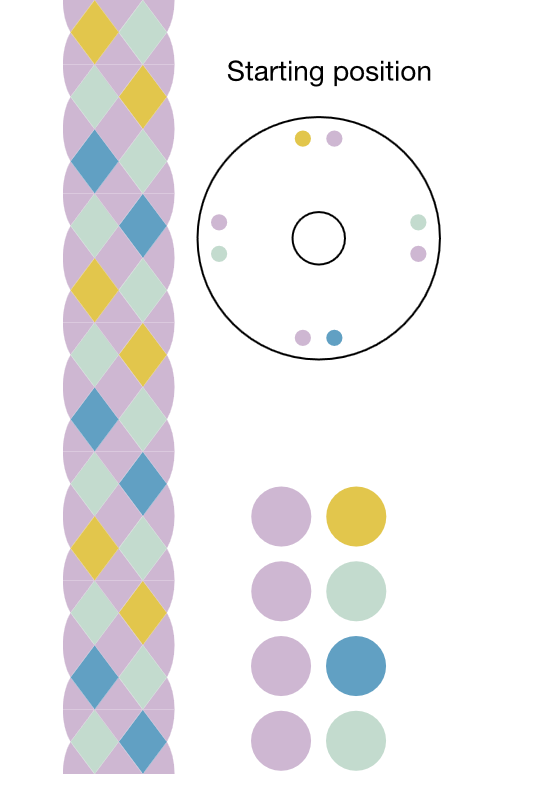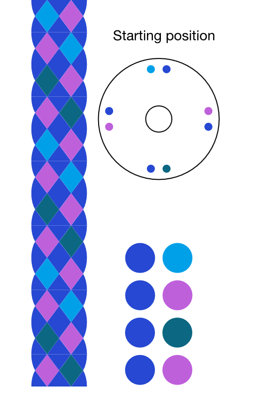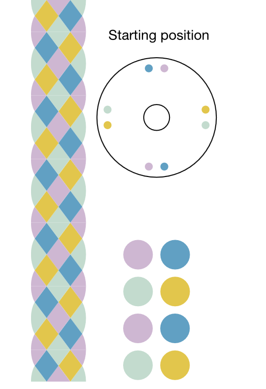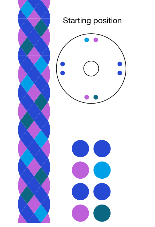 Yatsu-gumi is a traditional Japanese 8-strand braiding structure. The appearance of the finished braid varies depending on the layout and starting position. This simulator allows you to preview three layout variations using a four-color combination.
