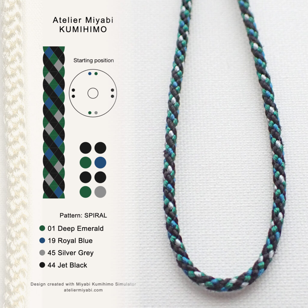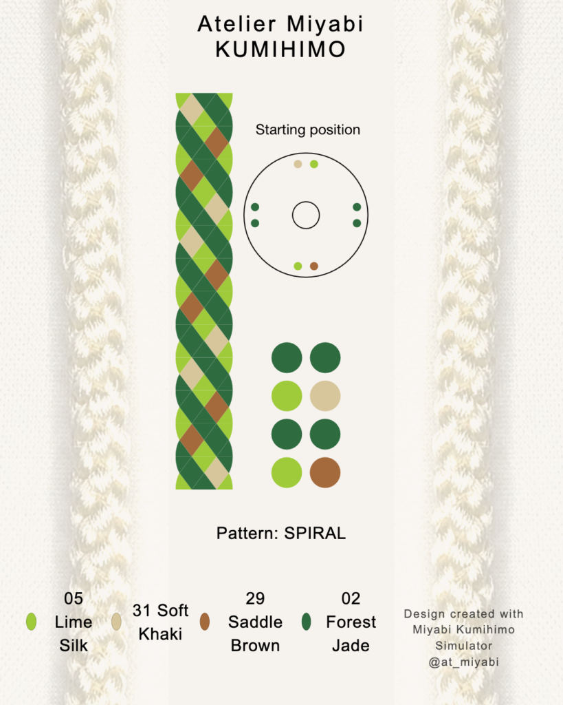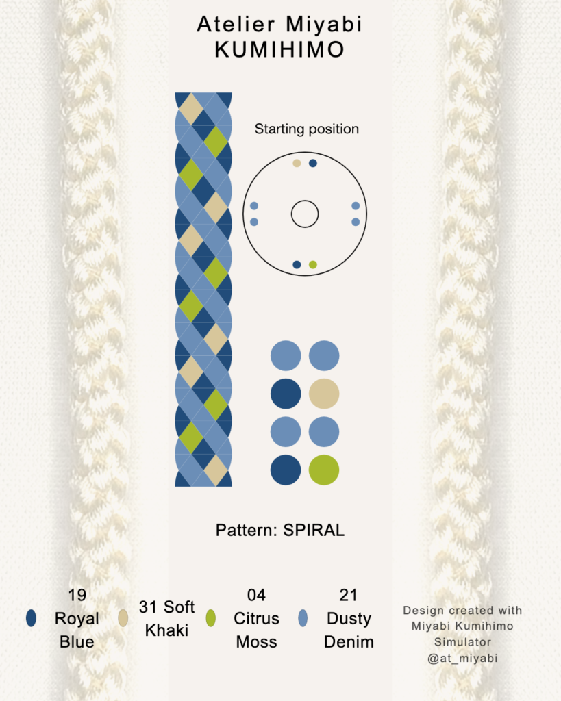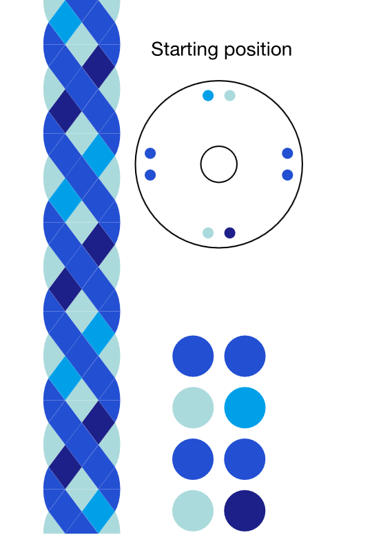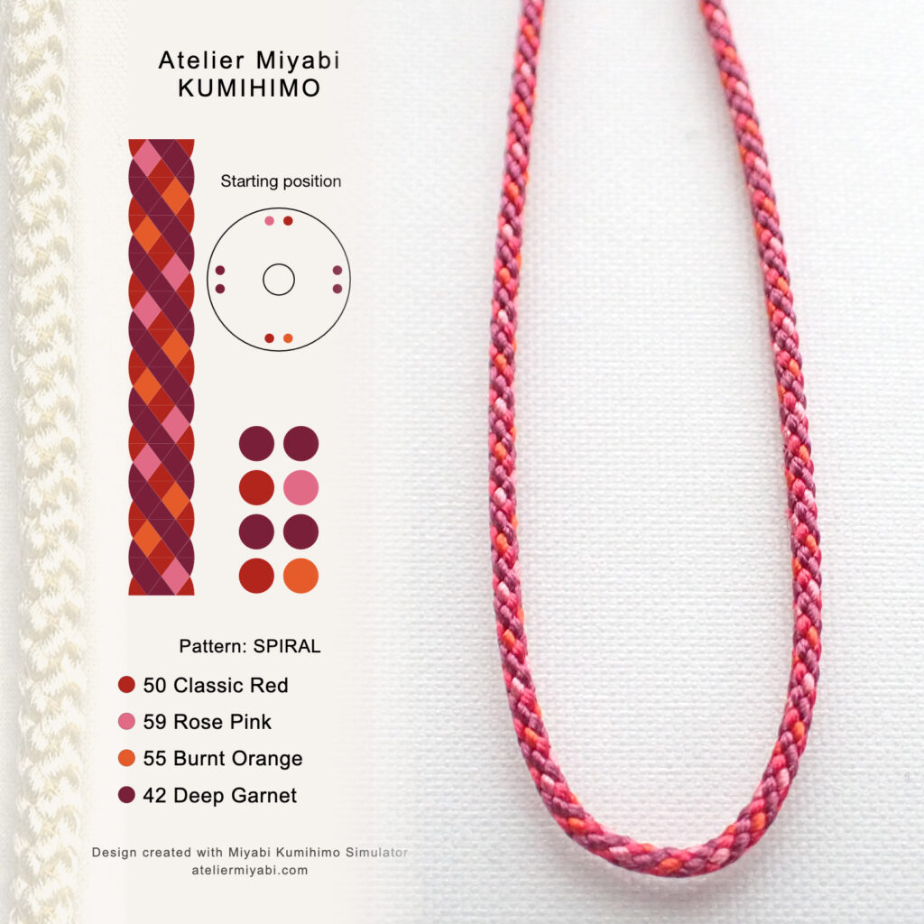 Use the online simulator to explore color balance and spiral layout for your 8-strand kumihimo cord. This tool serves as a visual reference for your preferred combination.