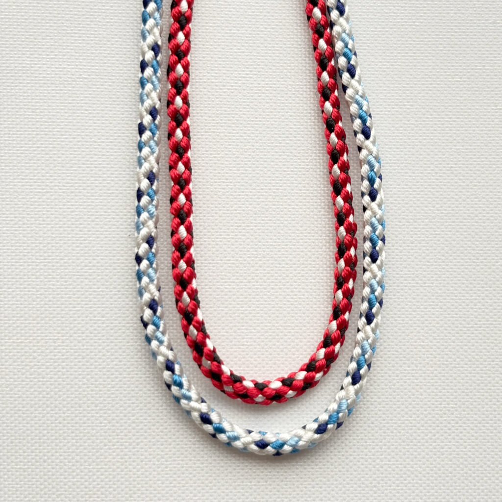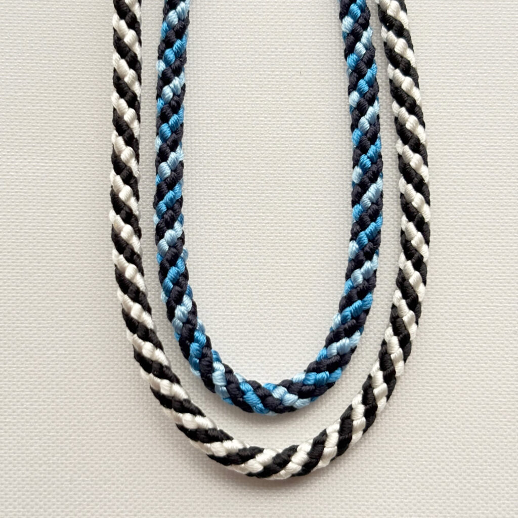Once a design is finalized, the cord can be produced using either natural silk or Silook® performance fiber through our custom kumihimo production service.