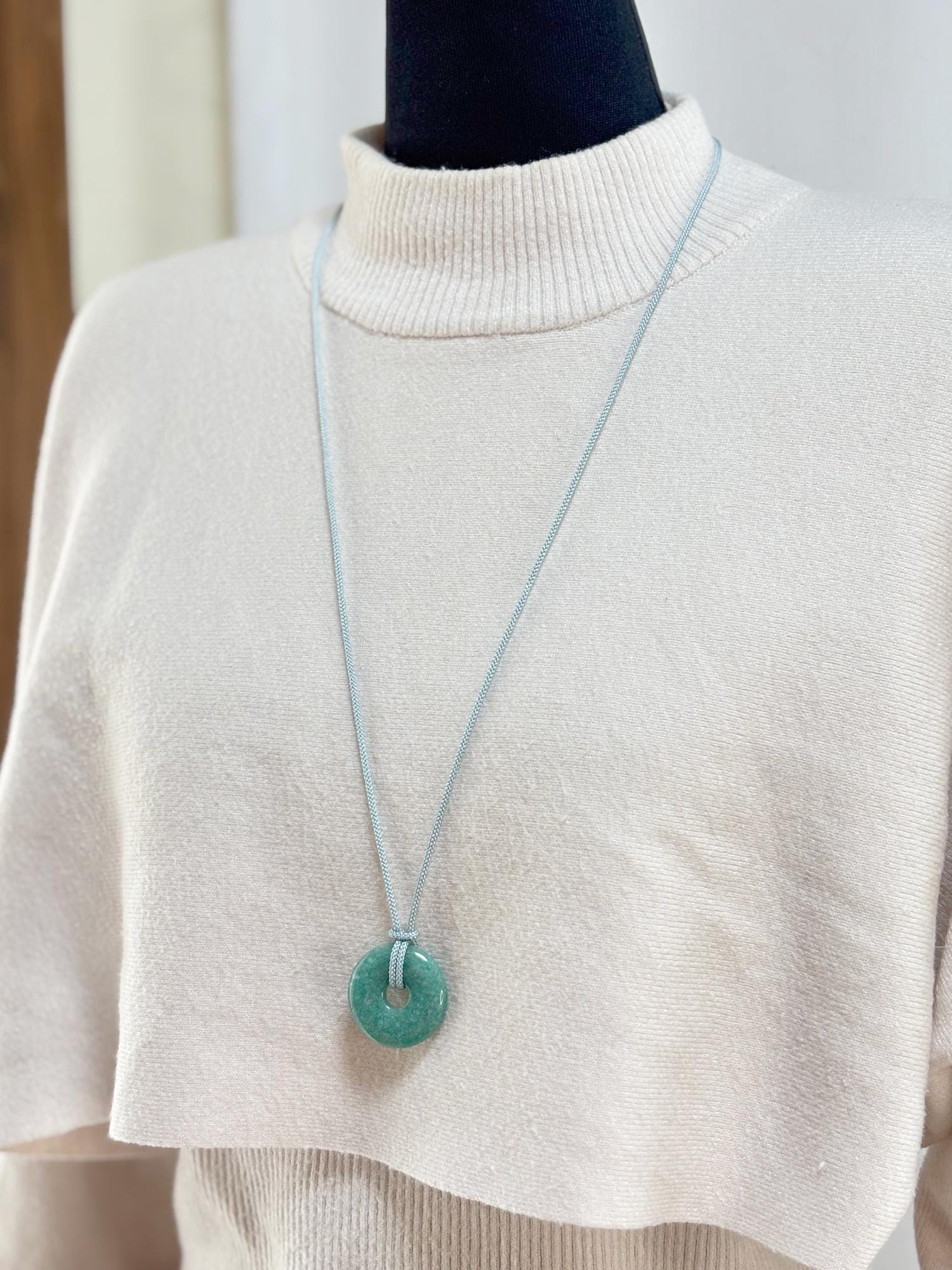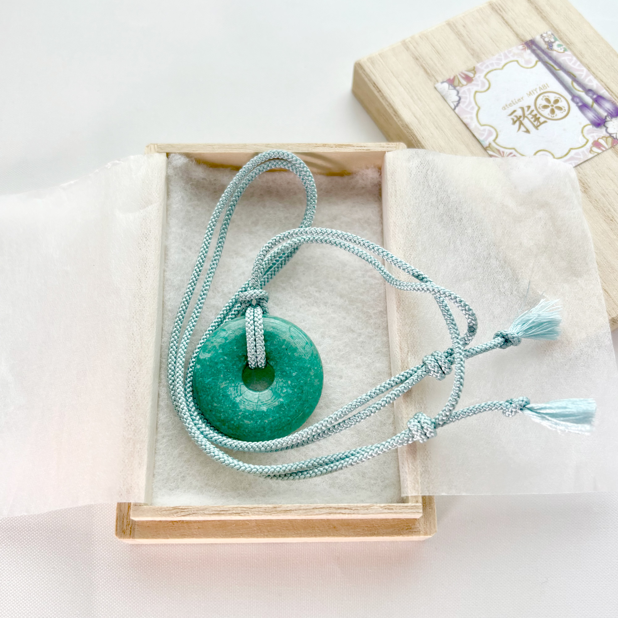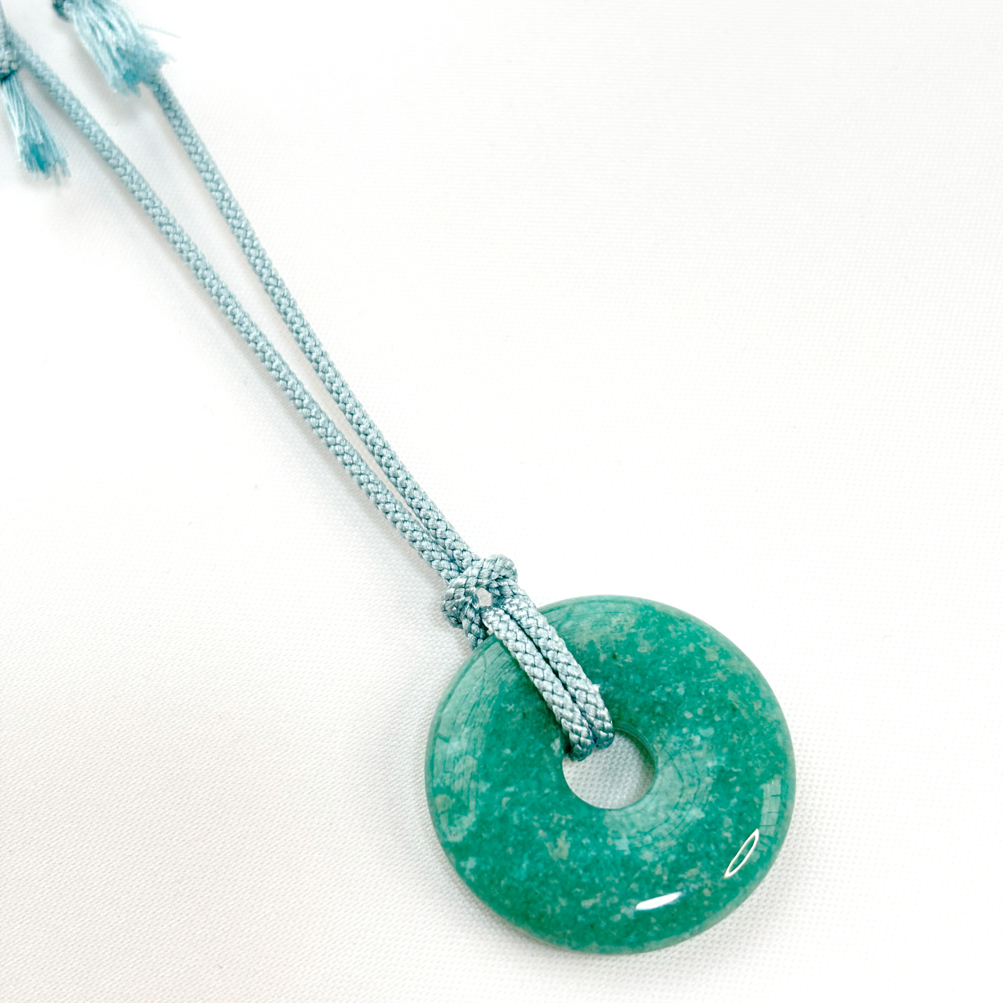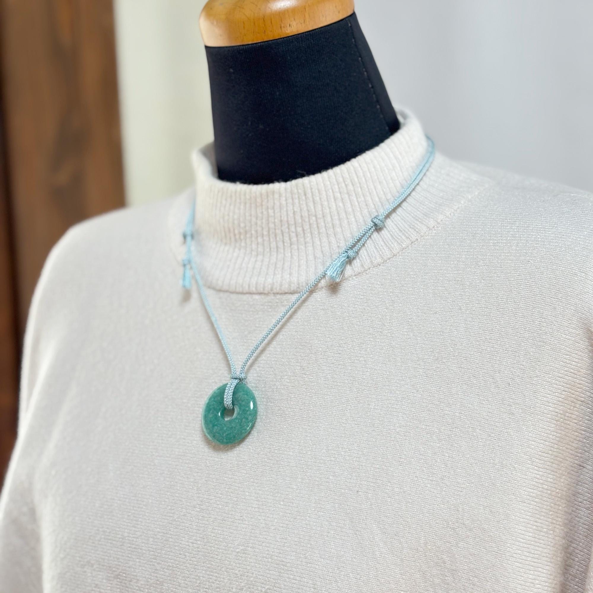 This necklace features a polished amazonite donut pendant paired with a soft aqua-blue silk kumihimo cord, handcrafted in Japan.
