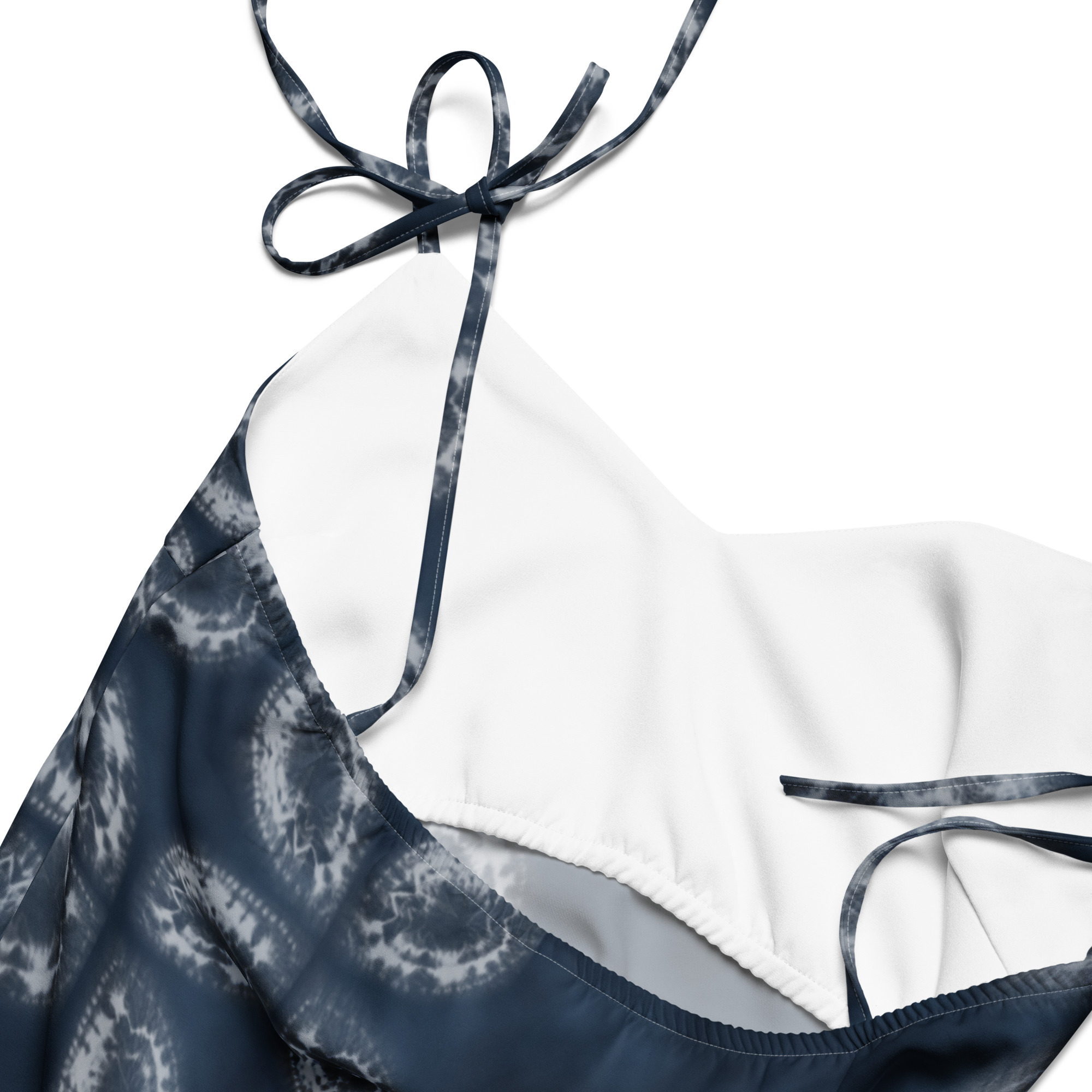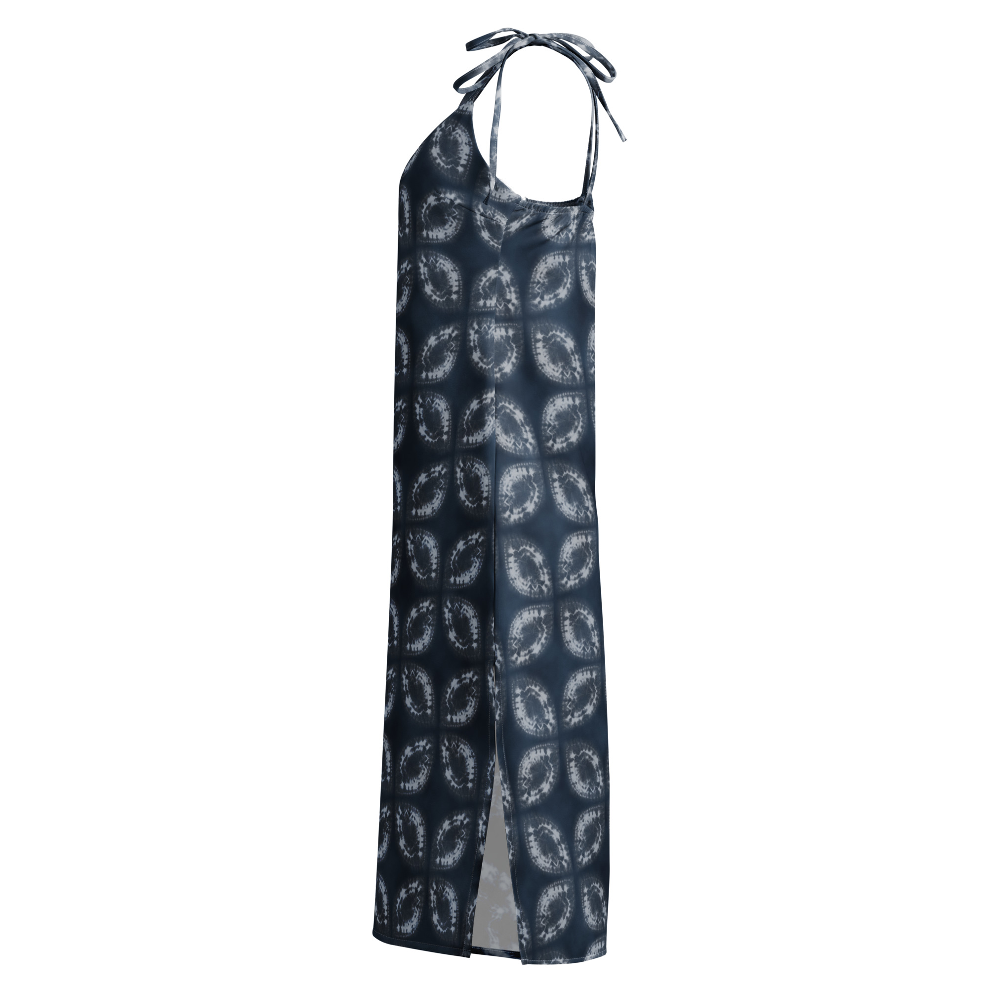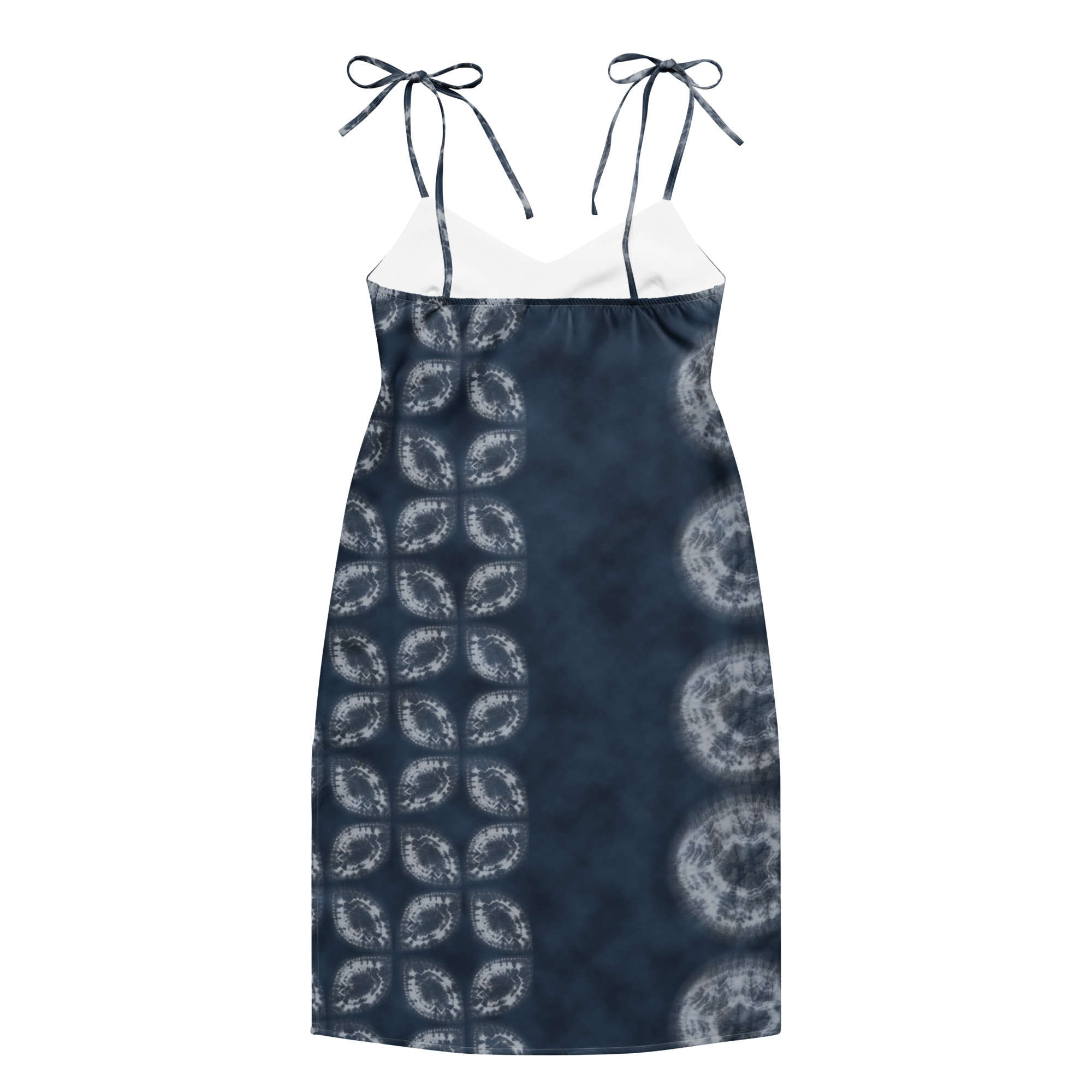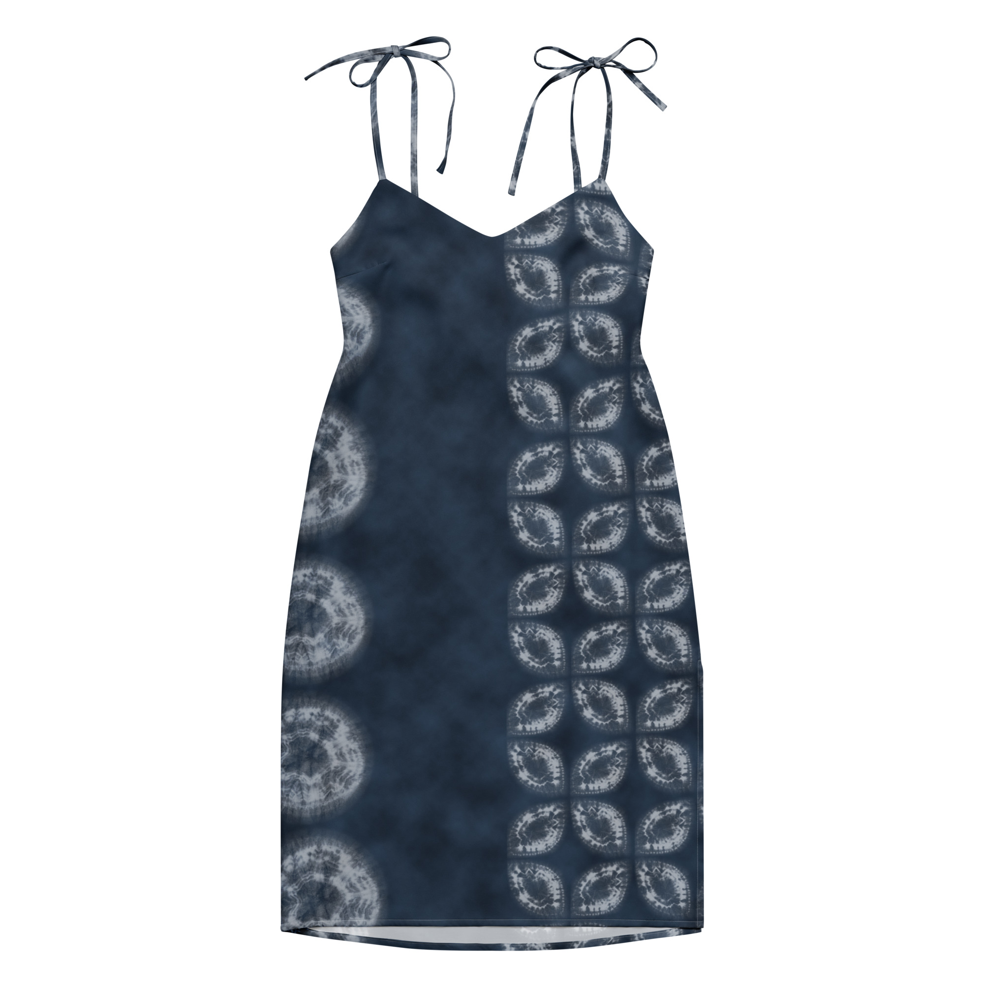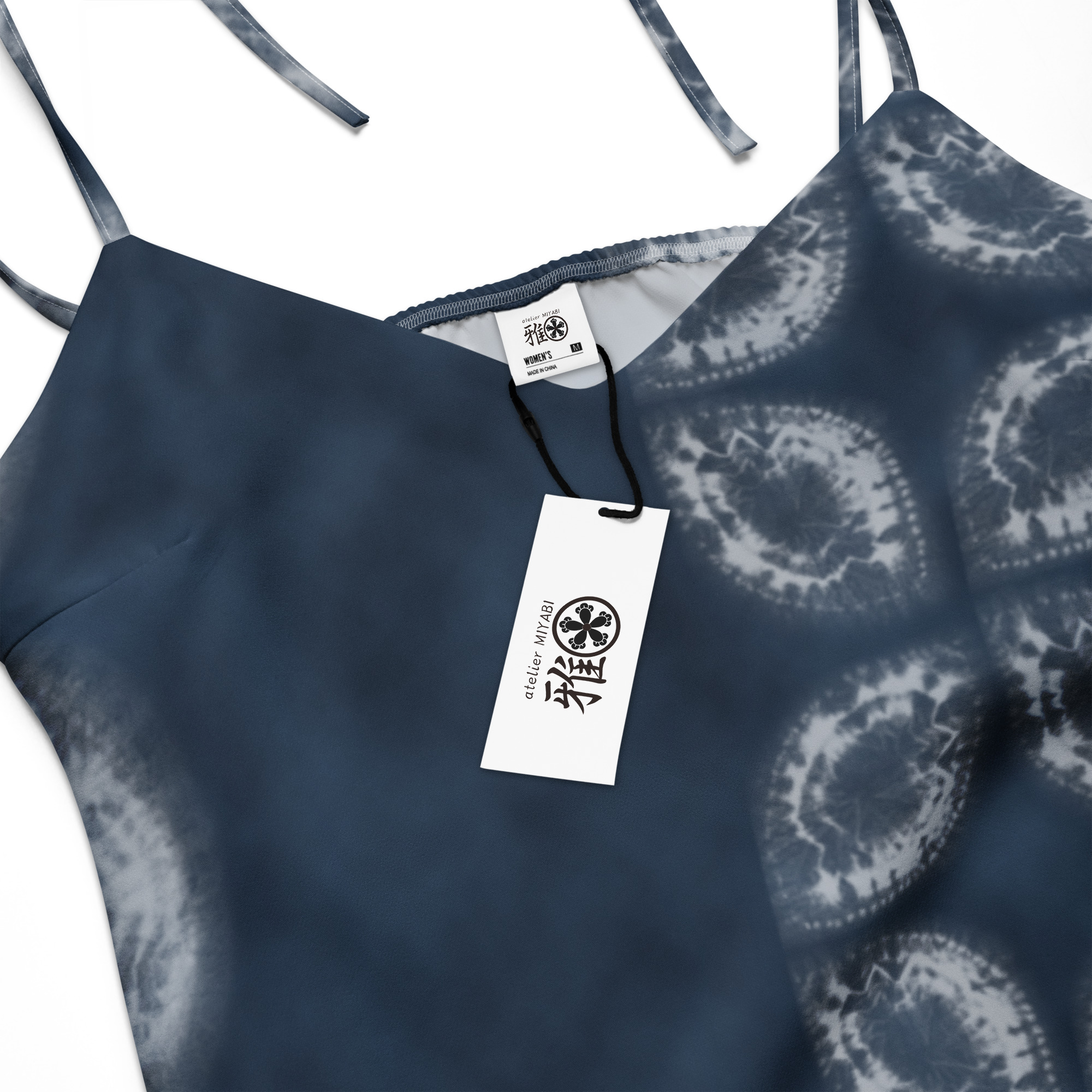 This slip dress features a deep indigo, monochrome design inspired by the visual language of traditional Japanese shibori.