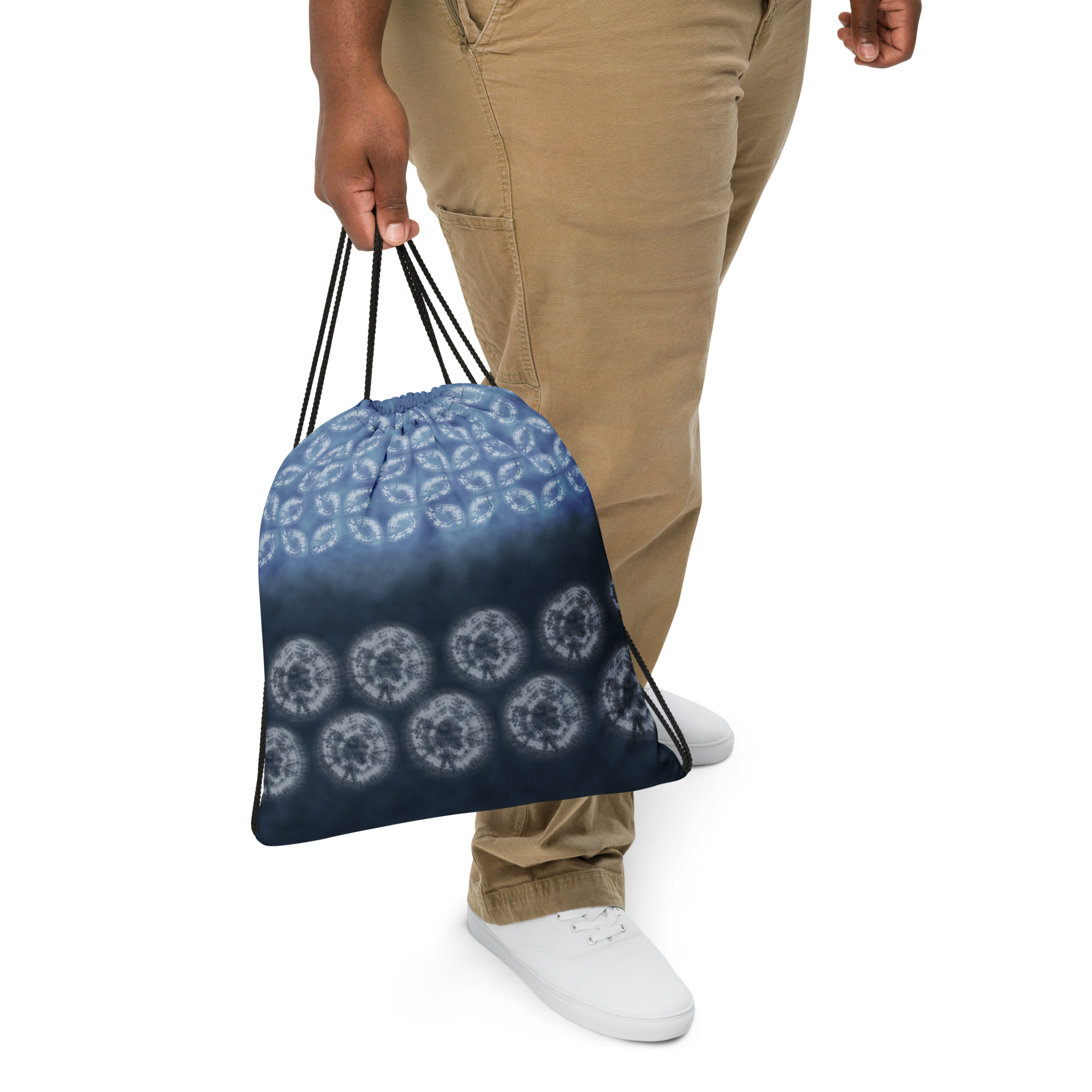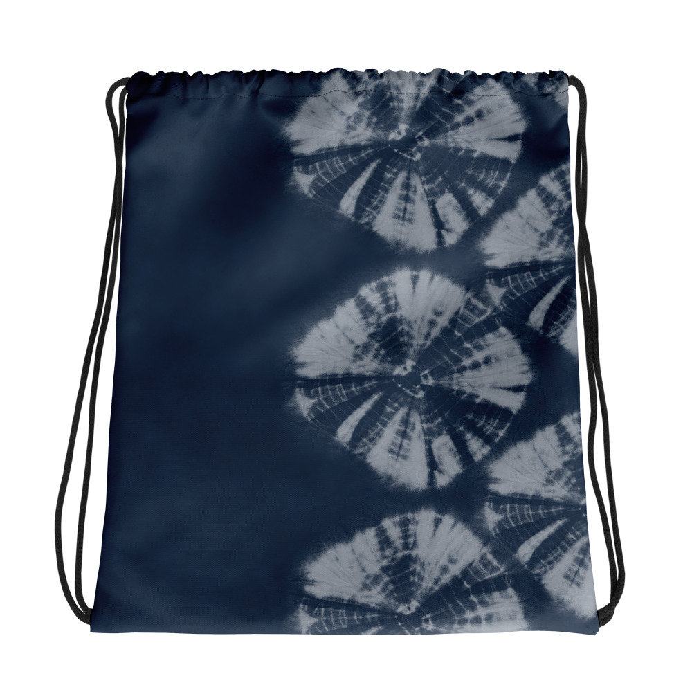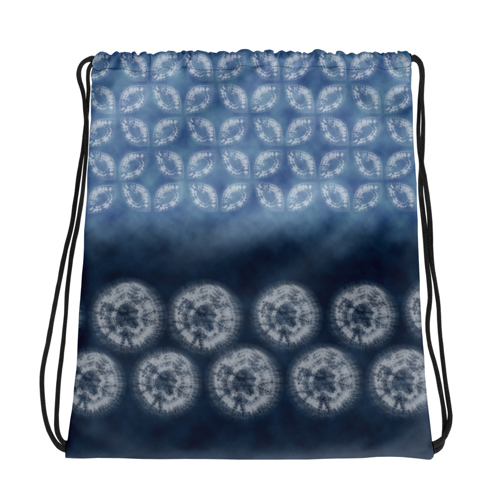 Inspired by traditional Japanese shibori patterns and indigo tones, this drawstring bag is made to carry costumes, fabrics, and personal items with ease.