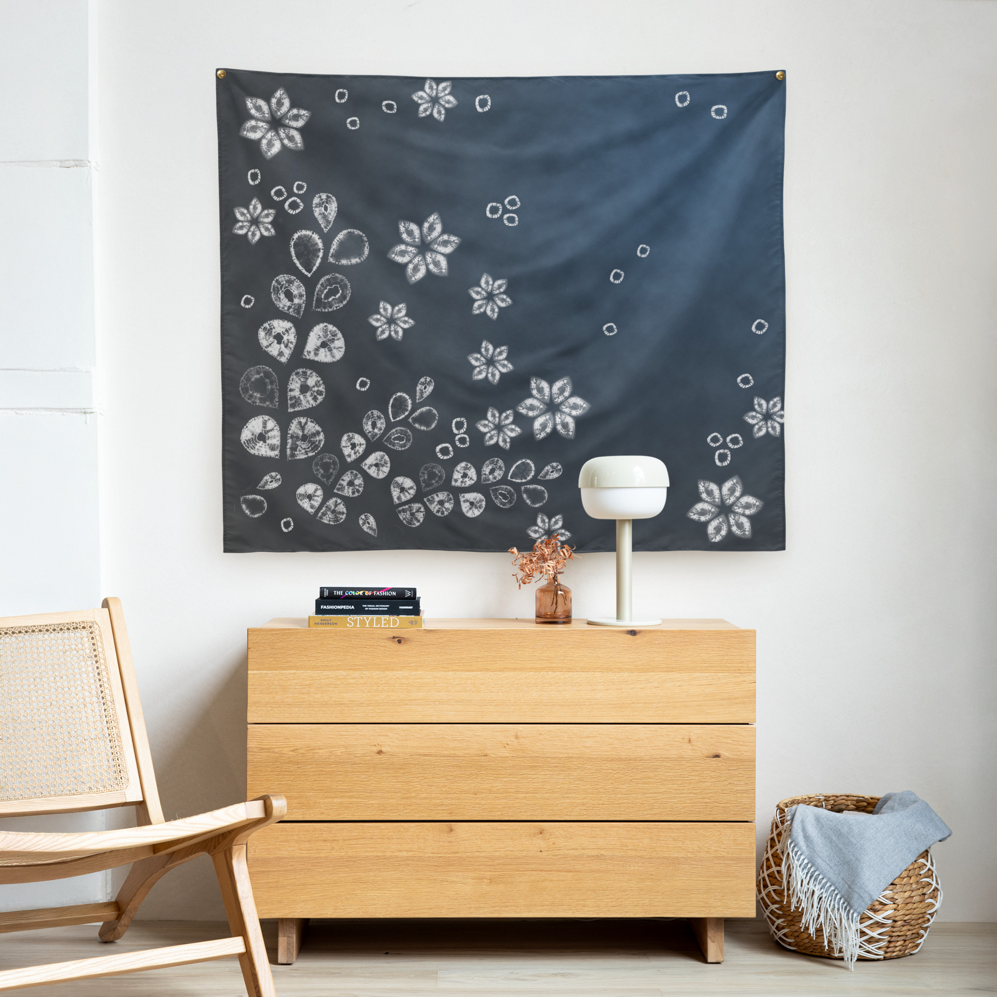 This 50″ x 60″ large fabric tapestry features soft floral-inspired motifs arranged across a deep indigo background. The flowing organic pattern brings warmth and movement to modern interiors while maintaining a calm, balanced aesthetic.