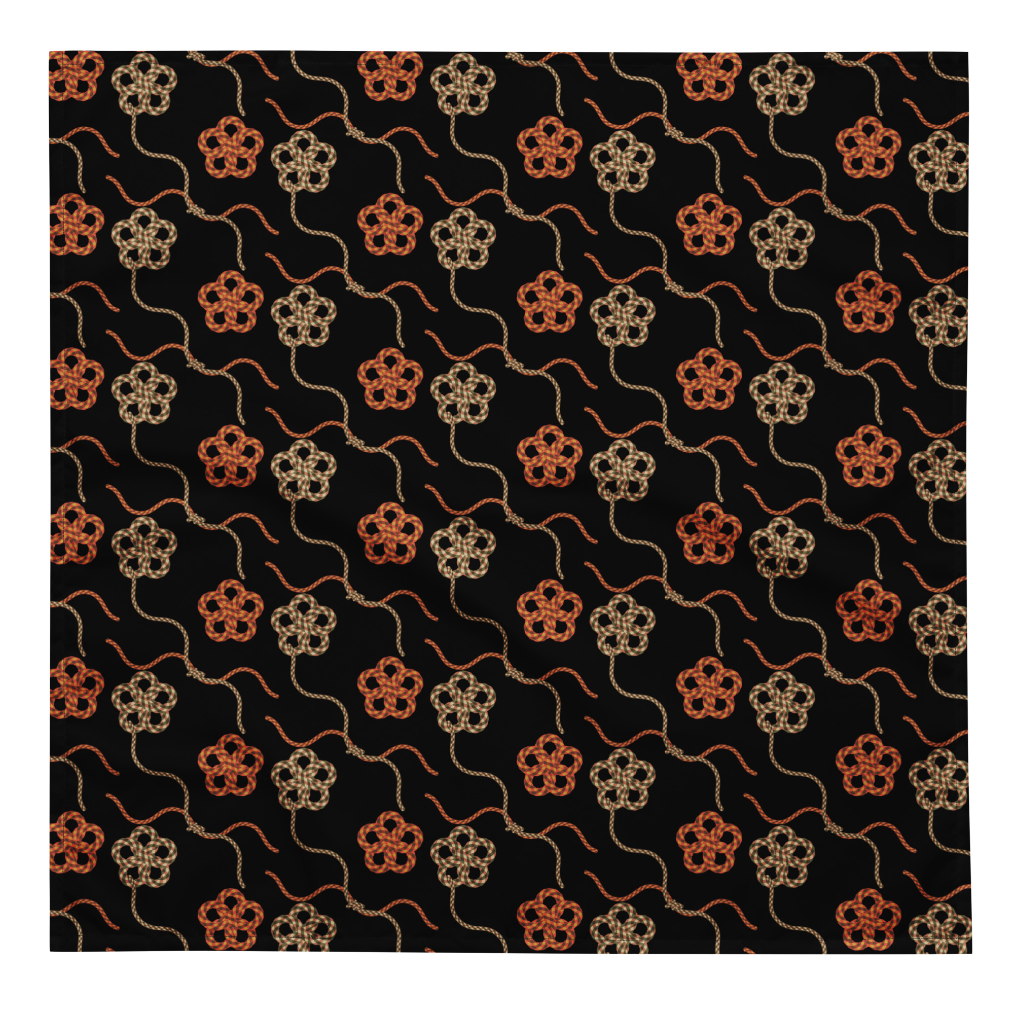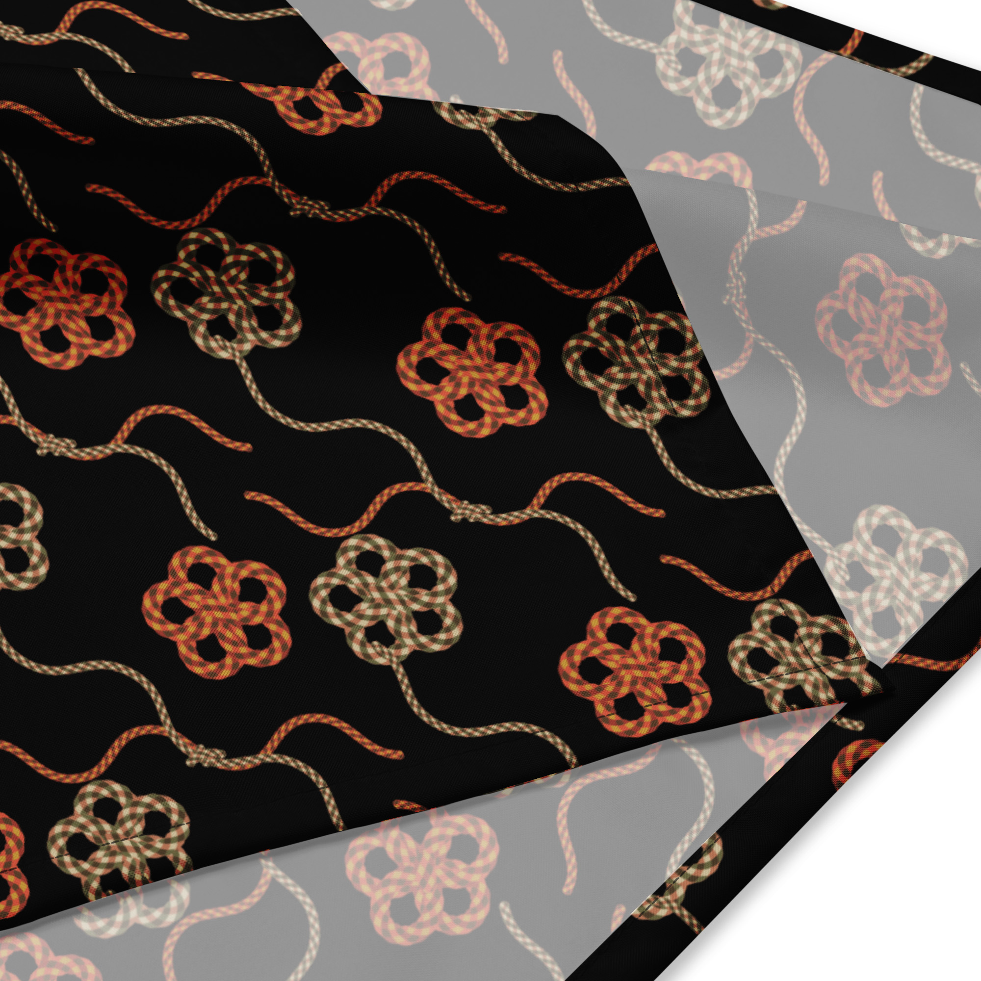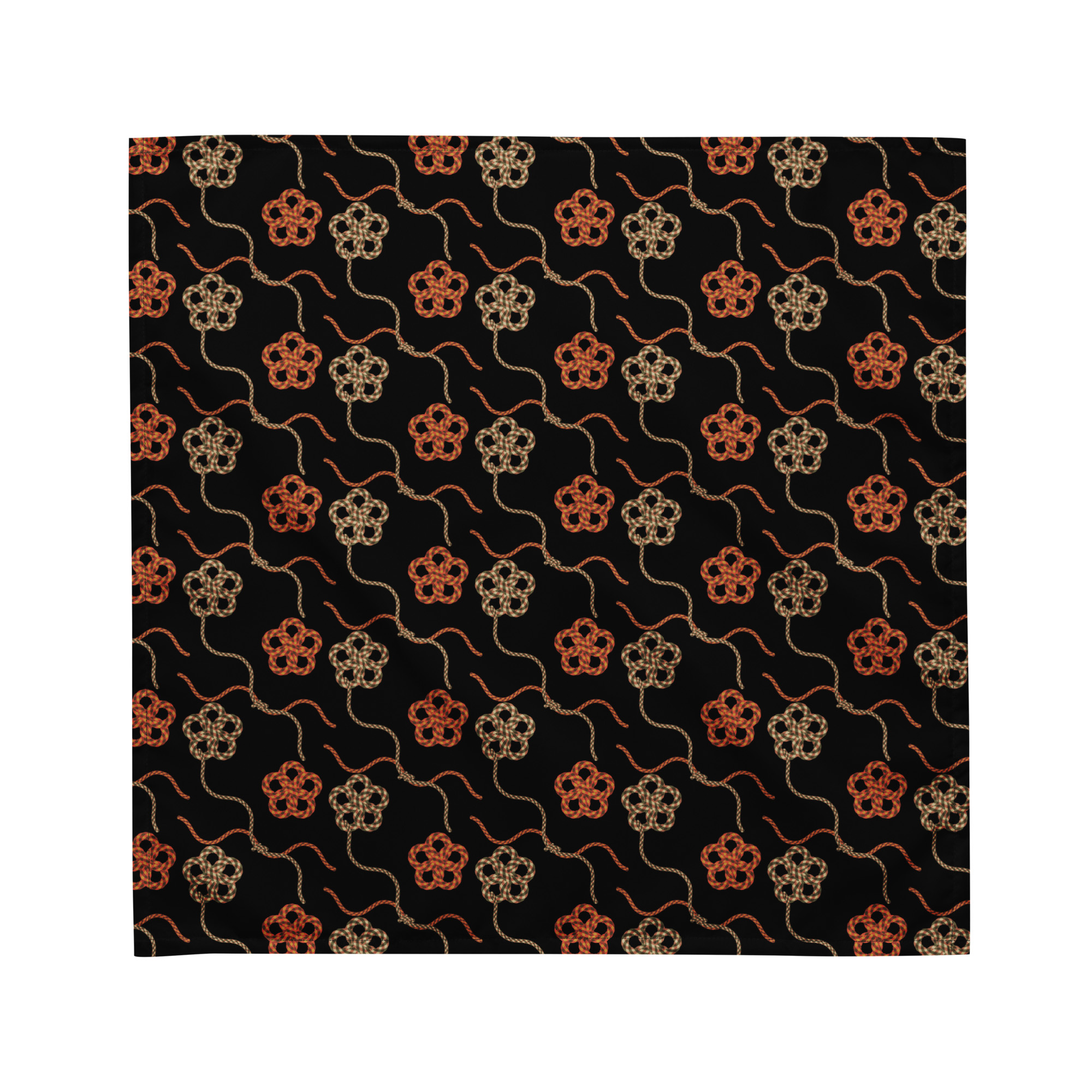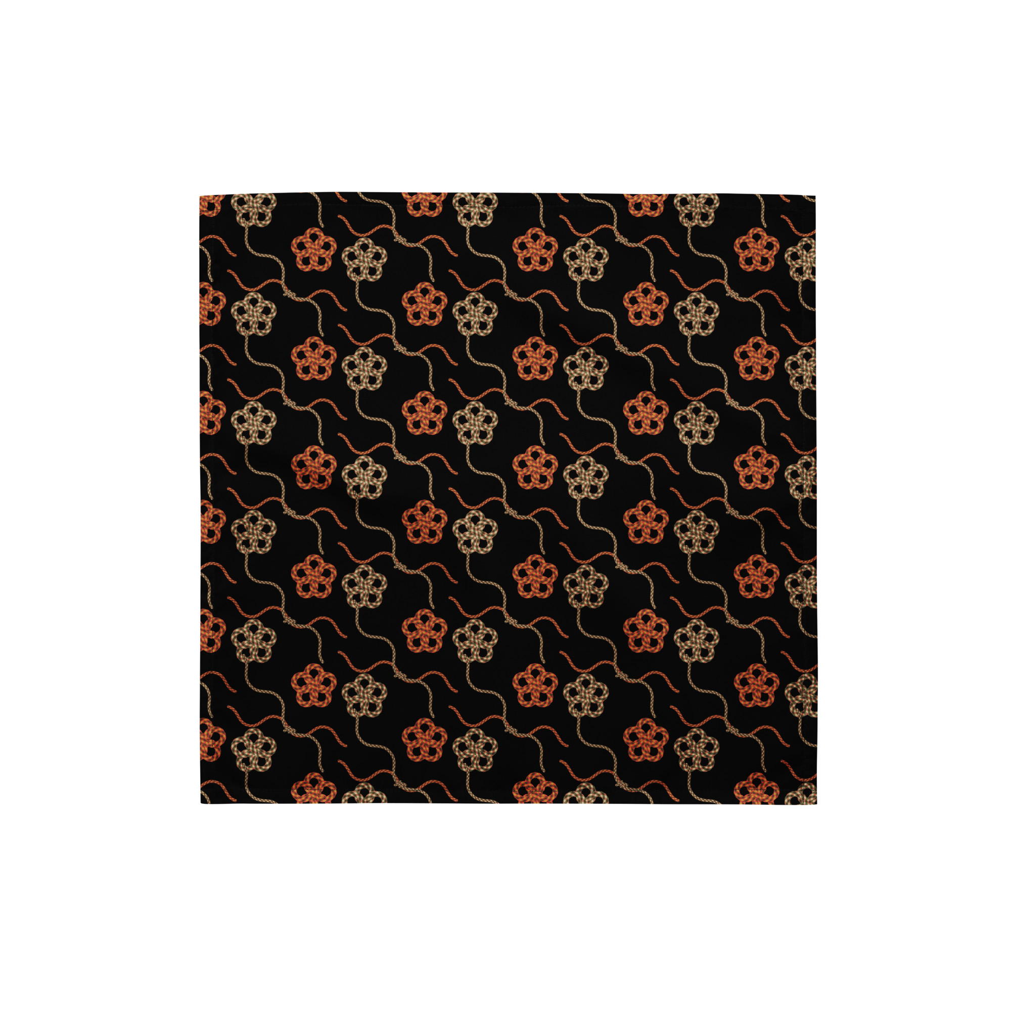 Black bandana-style furoshiki featuring an elegant Japanese knot floral pattern. Perfect for wrapping, fashion styling, and everyday use. Original Japanese textile design.