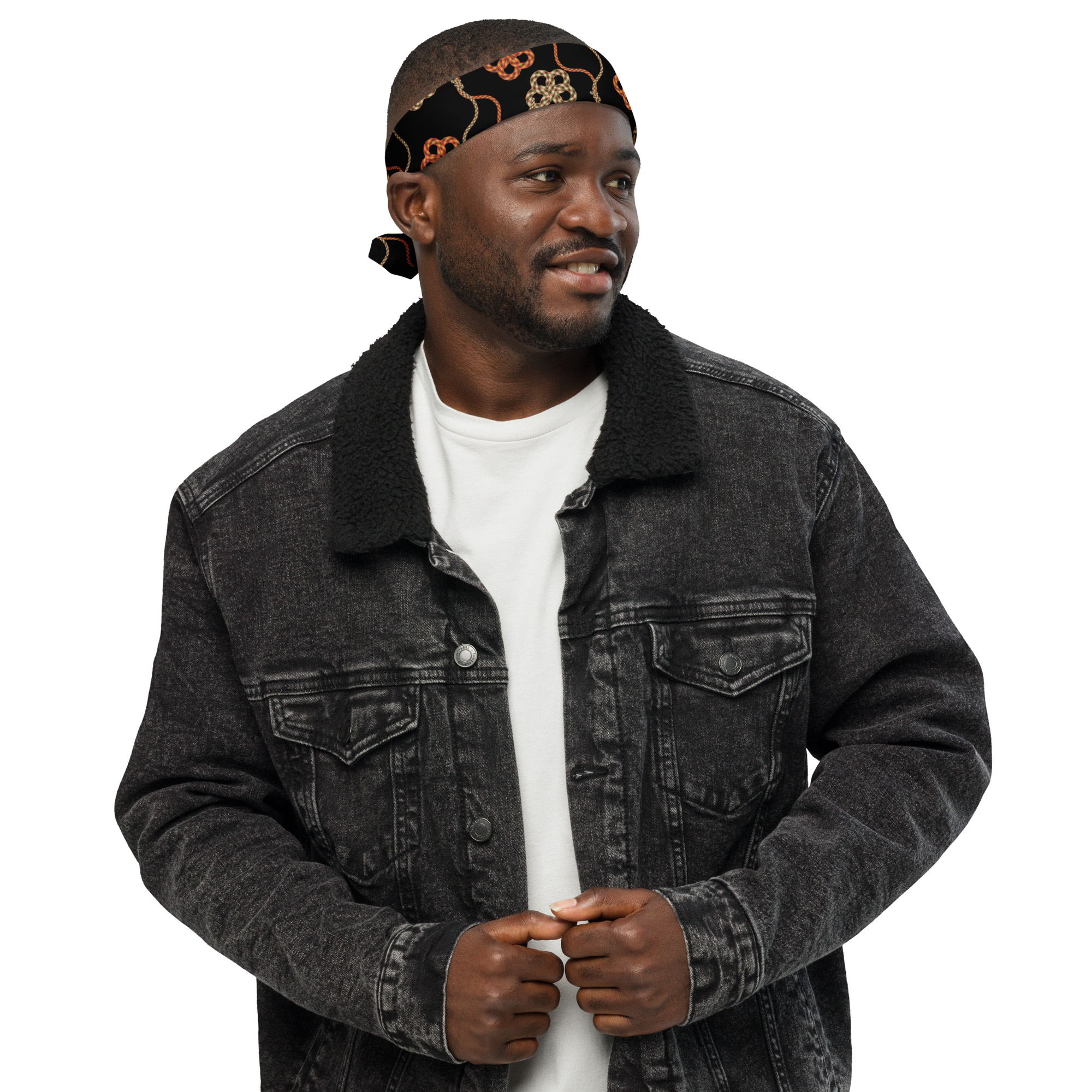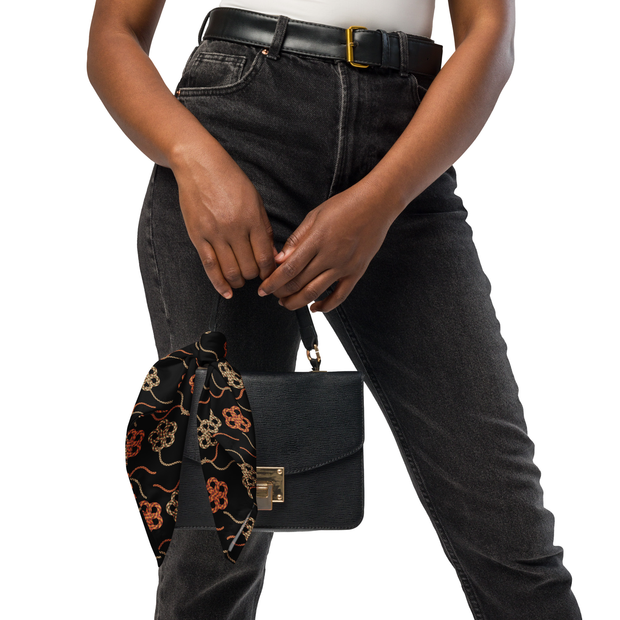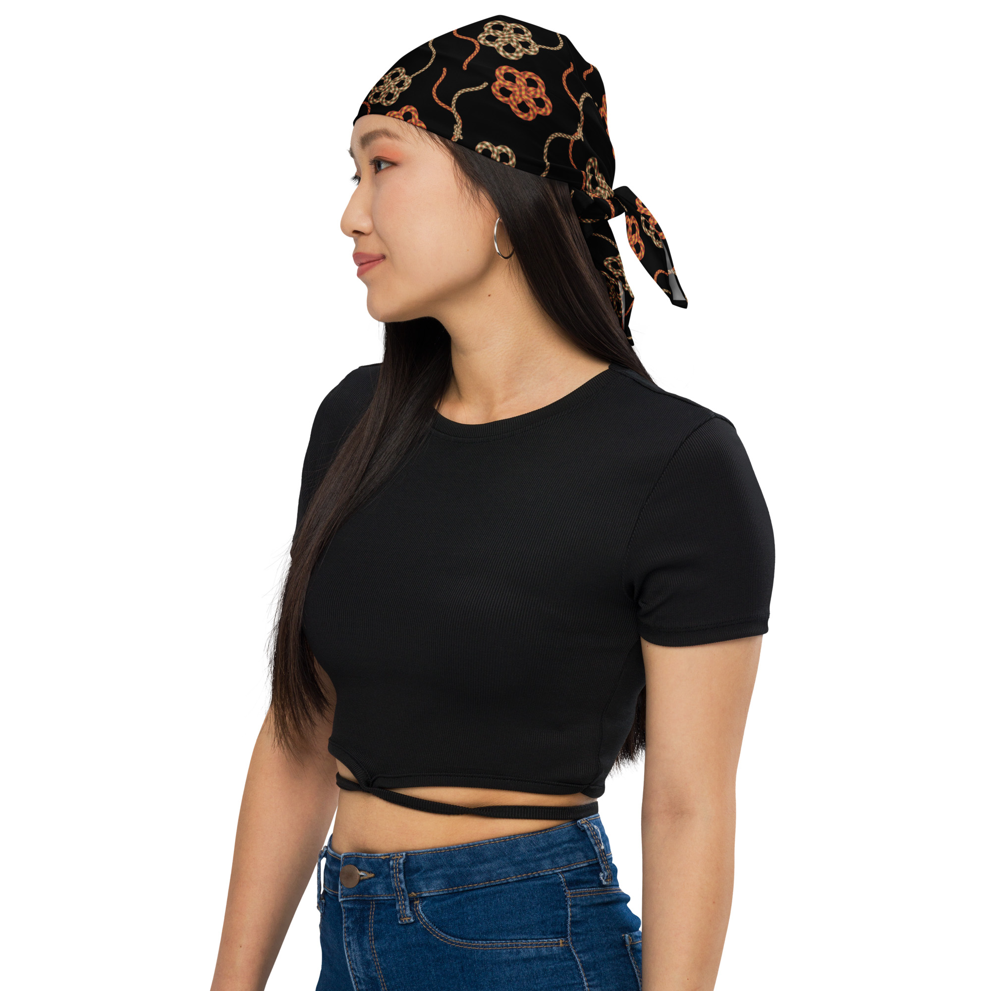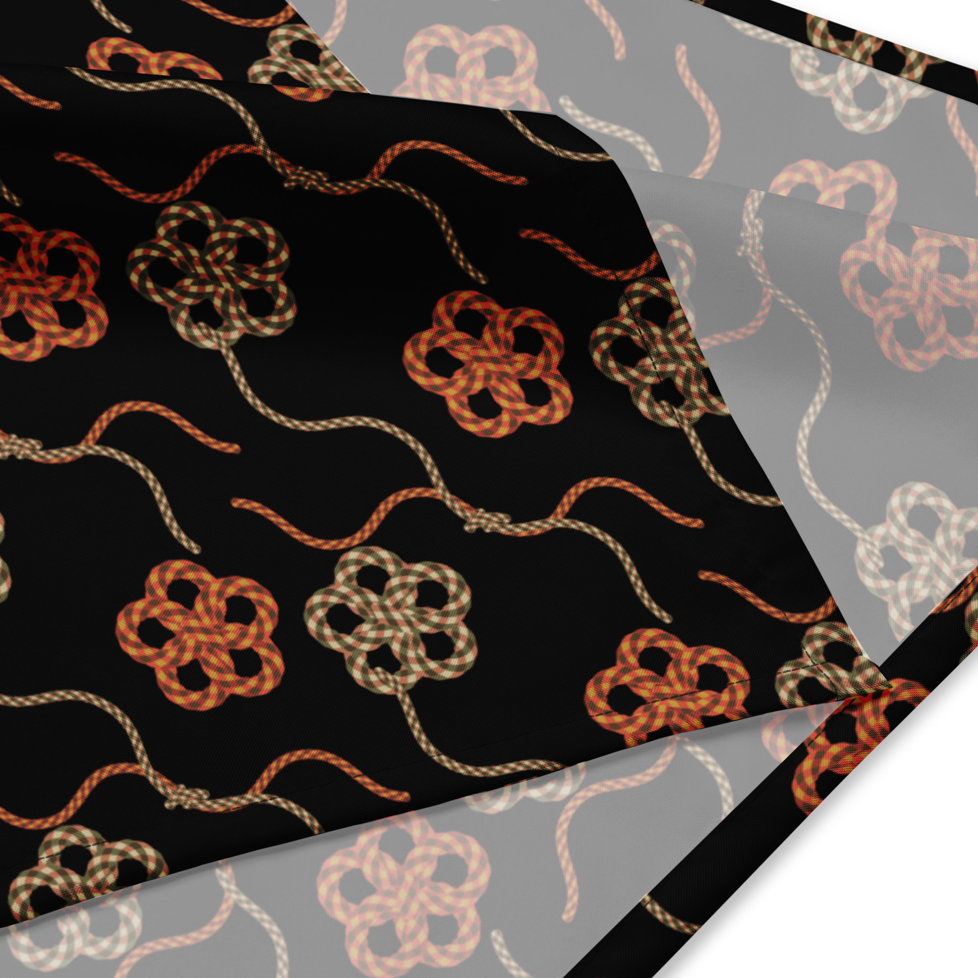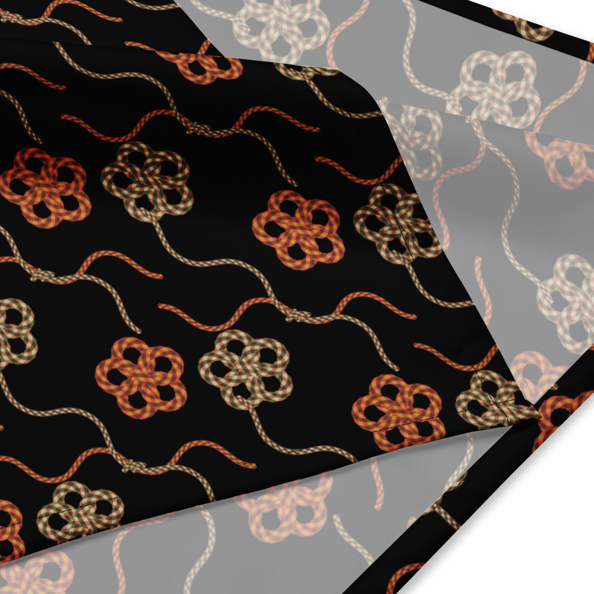 Black bandana-style furoshiki featuring an elegant Japanese knot floral pattern. Perfect for wrapping, fashion styling, and everyday use. Original Japanese textile design.