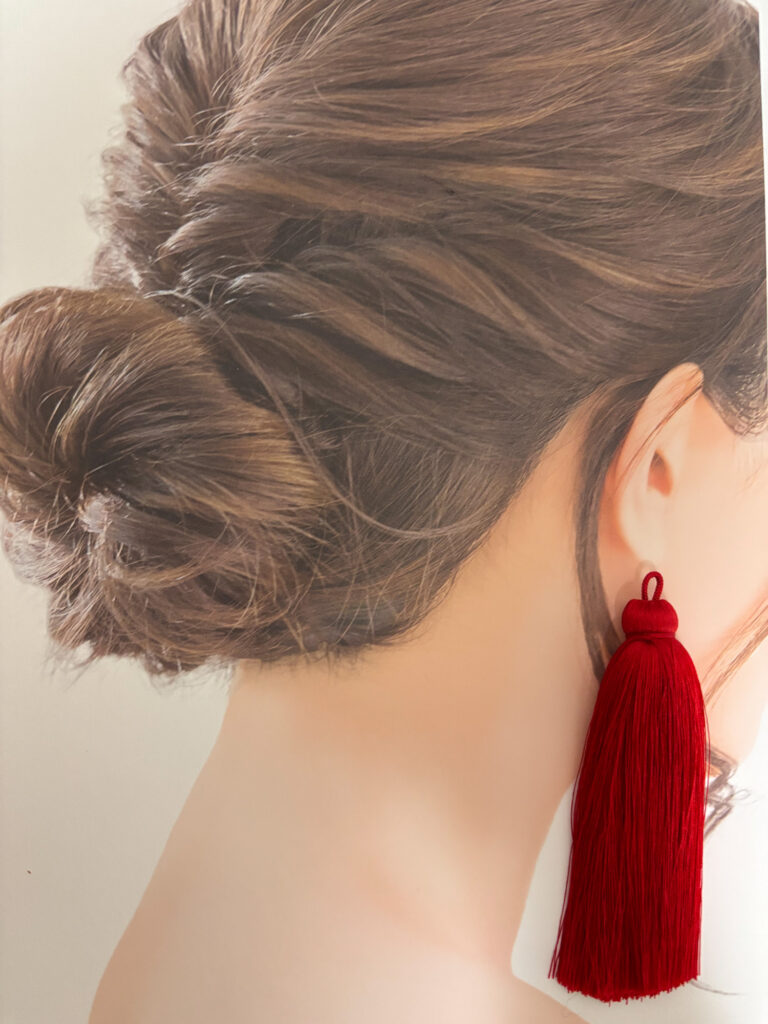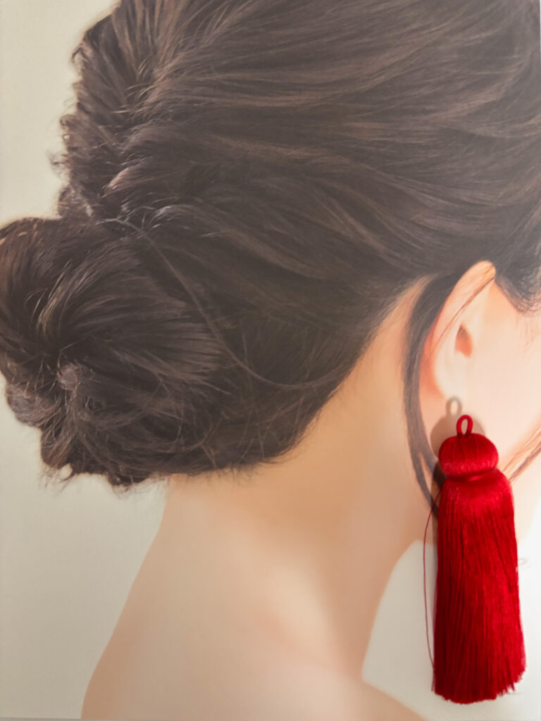 We can make a cord with tassels (“Fusahimo” in Japanese).